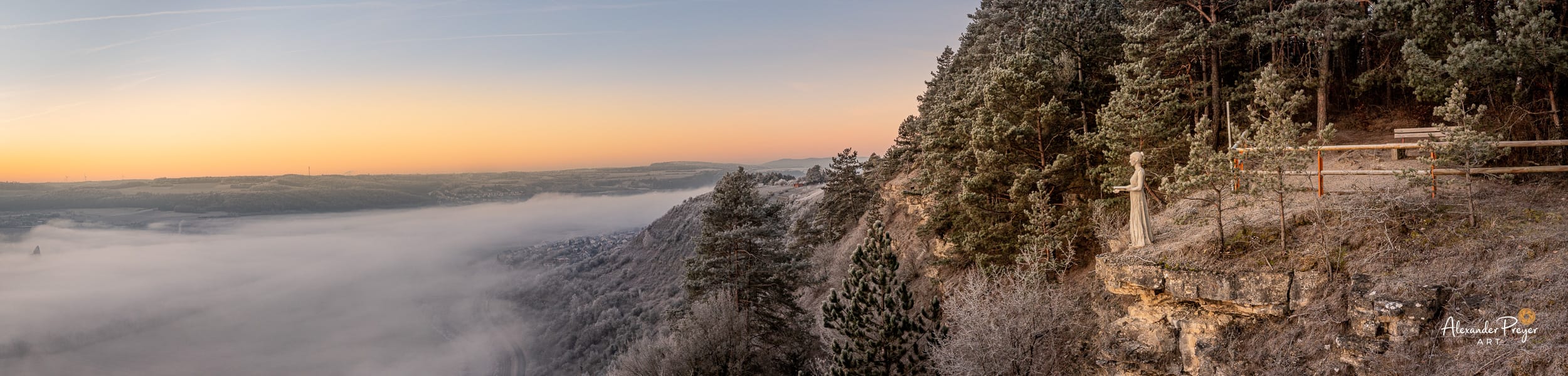 Nebel im Saaletal. Darüber Amalberga im Wald voller Raureif.
